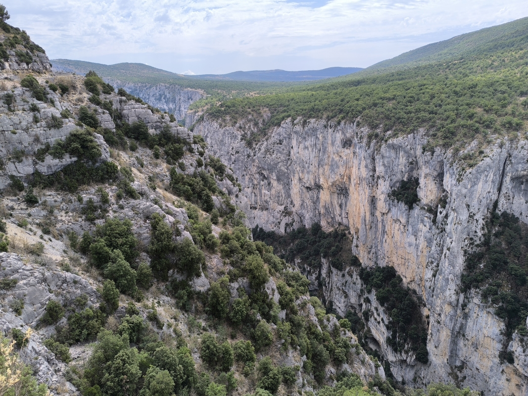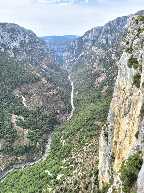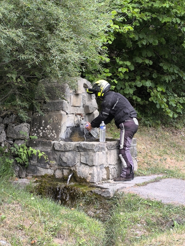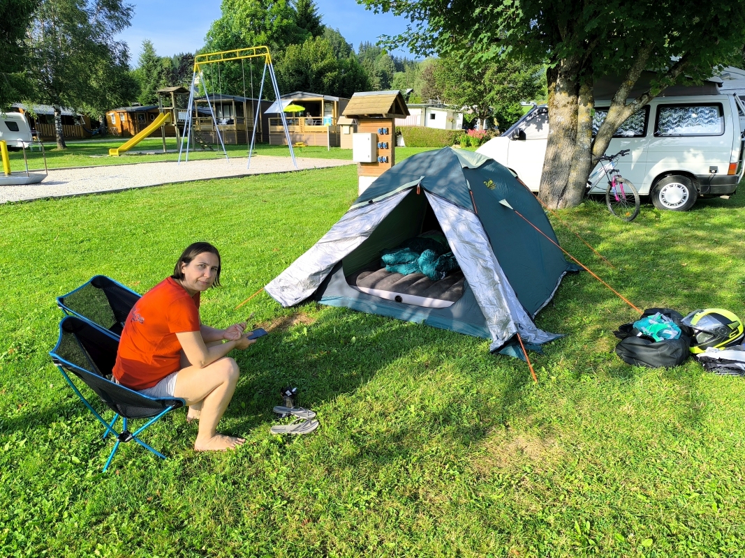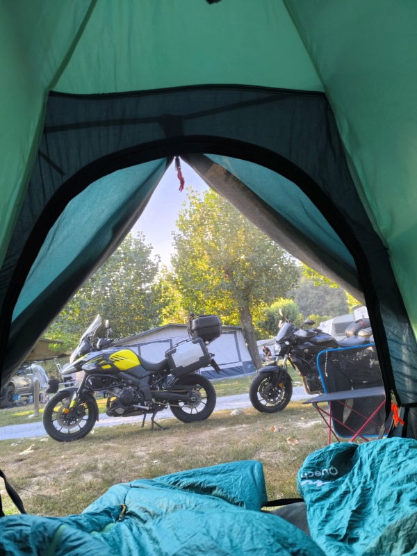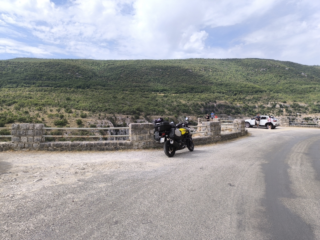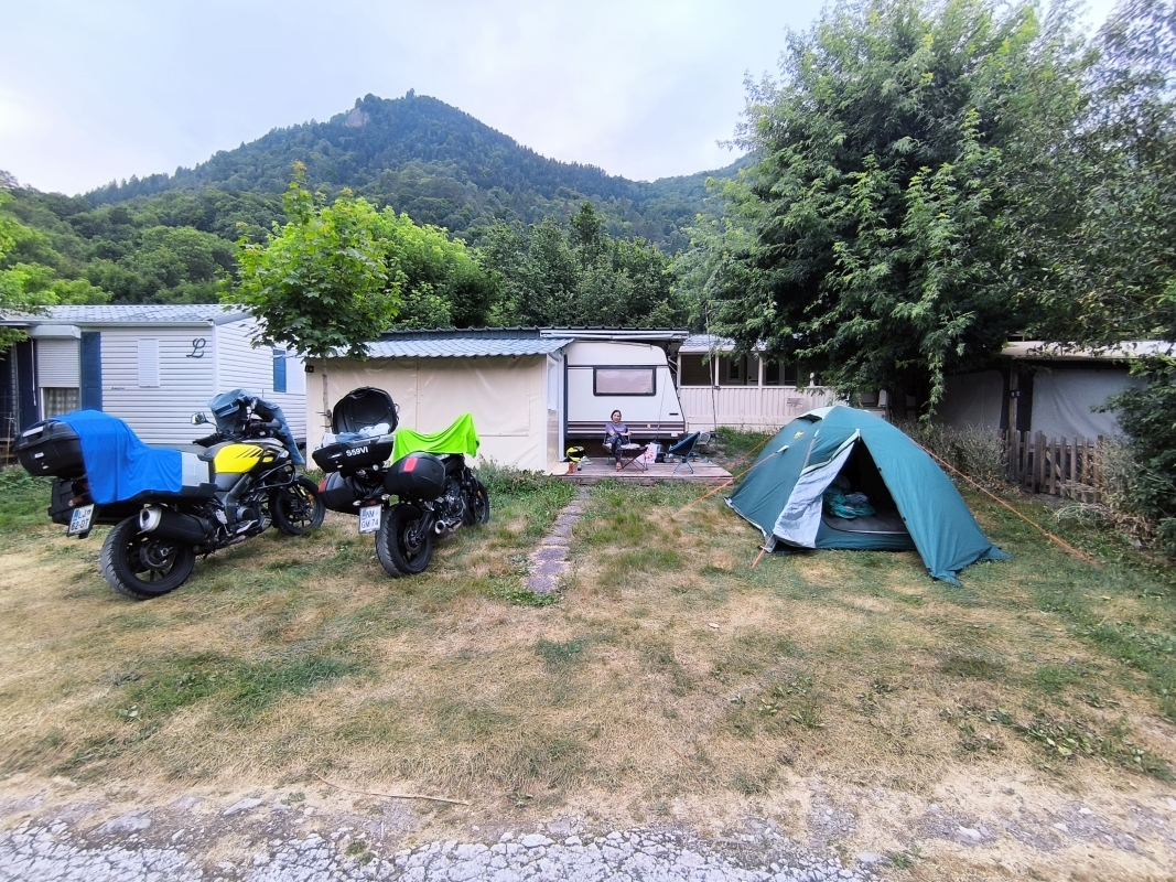 "Na zahod" 13. dan Noč je bila vroča, zato sva imela kar vse odprto. Če bi kdo s ceste hotel k nama, je imel prosto pot. Zjutraj sva se probala čim prej spraviti na pot, da se izogneva vsaj v neki meri visokim temperaturam. Itak, zjutraj ko je hladno, paše poležavat. Kot sem včeraj napisal, danes sva naredila tranzit v dolžini 440 km, do jezera Lac de Sainte Croix. Ni bilo posebnega dogajanja, saj sva peglala AC nekje v dolžini 350 km, pol pa lepa podeželska cesta do cilja. Res je, lepo se je peljati po AC s tremi pasovi, človek se hitro razvadi, saj ni take hektike kot pri nas. Odločila sva se, da bova kampirala, je največ svobode, miru, pa tudi najbolj poceni. Če v sobi ali apartmaju ni klime, je boljše kampirati, preizkušeno. Tudi postavljanje in podiranje šotora je mala malica. Ko sva prišla do jezera, sva imela označen kamp z bazenom. Na recepciji razočaranje, ni prostora niti za en mali šotor. So bili pa toliko prijazni in so nama povedali za kamp, ki je malo vstran od jezera in bi lahko imeli prostor. Pa ne no, ne vstran!!!! Probava še 4 najbližje kampe, vse polno. Na, koncu sva res šla v oni kamp, kjer je res bil prostor. Na hitro postaviva šotor in gas do jezera na kopanje. Kdor me pozna, nisem ljubitelj kopanja po jezerih, ampak po toplem dnevu na motorju, sprejmem tudi to. Na koncu se je izkazalo kot dobra varianta. Voda čista, glih prav topla, super je bilo. Čez cesto sva našla tudi večerjo, kar je super. Med večerjo je začelo pihat, dvigovalo je tende. Glih ko sva dobila hrano, je letelo vse po zraku. Par gostov se je obesilo na vogale tende, nekateri pa smo se v miru najedli. Sem že imel v mislih izmeno, pa je na srečo nehalo pihat. Včasih imam tudi srečo. Upam, da sva na šotoru vse zaprla, ker to pišem v lokalu v bližnjem mestu. V kampu ni signala, Wi-Fi pa imajo plačljiv. Tega že dolgo nisem videl, pa sem bivakiral že masikje. Nisva in ne bova plačala. Dežuje še prav nežno, pomeni bo vožnja do kampa vlažna. Nekaj pa je res, cot nama ne bo zmočilo, ker sva se pripeljala sem skoraj naga. Jutri pa nekam naprej, verjetno v hribe.