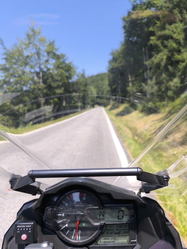 "Na zahod" 2. dan Alpski hotel je nudil udobno posteljo, s skupno odejo. To tokrat začuda ni bila težava, ker sem se je zgleda v štartu odpovedal. Zajtrk zelo dober, stoli pa za moje stanje katastrofa, ker so se v sredini globoko pogrezali in to mi je povzročalo bolečine. Samo za informacijo, ko vozim motor, me ne boli nič. Vem, za marsikoga čudno, ampak tako je. Po zajtrku sva se spuščala po zelo lepi cesti in pot nadaljevala v smeri prelaza Col du Lautaret. Orgazmično lepa pokrajina, vozila sva po dolini, iz leve in desne so naju objemali visoki vrhovi, s katerih teče voda, saj je zgoraj še vedno sneg. Ko sva se začela vzpenjati, sva na cesti videla ogromno napisov "ROGLA" in "POGI". Z vrha so se ponujali krasni razgledi (2058m). Lahko bi se začela spuščati na drugo stran, ampak... Tukaj je še en odcep desno, še na višji prelaz z imenom Col du Galibier (2642m). Sonce, hribi, kar nekaj ljudi, noro lepo. Temperatura okoli 20°C. Glavni zračniki na jaknah so zaprti, ker med vožnjo, kar lepo hladi. Itak ne voziva hitro, ker gledava naokoli. Od tod je sledil spust v Saint Michel de Maurienne, kjer sva zavila na sever, saj sva si, že prej ogledala prelaz Col du Glandon. Vmes sva se ustavila v neki vasici, ker je žeja vedno hujša od domotožja. Prijazen lastnik je govoril izključno francosko, midva pa vse jezike, kar sva se jih spomnila, vse smo se dogovorili in razšli z velikim nasmeškom na licih. Še obstajajo prijazni ljudje, ki se ukvarjajo s popolnimi tujci. Trudil se je razložiti, kako do prelaza. Na koncu naju je vprašal, če bova vzela hladno vodo, kar sva z veseljem prikimala. Napolnil nama je plastenke, ki so kasneje še kako prav prišle. Cesta na Col du Glandon je bila dokaj ozka in lepa za vozit. Proti koncu se je res strmo vzpenjala, skratka strme in ozke serpetine. Človek bi rekel, da se namatraš in moliš boga, da koga ne srečaš v ovinku. To cesto bi odsvetoval začetnikom. Ko prideš na vrh je vse poplačano. Zopet bom napisal, da so nori razgledi, kako drugače težko rečem. No, pol pa sva se spustila proti Grenoble. Vmes sva naletela na eno umetno jezero, ljudje se kopajo, kampirajo, prav luštno. Ko sva prispela v dolino, naju je čakalo celih 35°C. Jebemomilomater, a zopet???? Zapeljala sva se v center Grenobla, sparkirala, se preobula in šla malo v mesto. Itak lačna, potrebno je bilo probati francoske slane palačinke z različnimi polnili. Moram reči, da sem se lepo najedelel, glih prav. Ko je preveč, težko zapnem jakno, tokrat je bilo vse ok. Tukaj sva se tudi odločila za kampiranje v hribih, ker je bolj hladno. Bil sem optimist in poskušal poklicati v kampe. Probal sem v dveh kampih. Na eni cifri se je oglasila avtomatska tajnica, če sem iskren, je nisem prav nič razumel. Na številki od drugega kampa, pa se je javil odzivnik operaterja, ki mi je povedal, da številka ne obstaja. No, pol pa se pelji, če ne veš ali kamp še sploh obstaja. Vseeno sva šla. Karmen je verjela, da bo vse ok. Na poti sva videla za cesto dva motorista, na hitro je zgledalo, da ima prazno zadnjo gumo. Malo višje sem obrnil in se vrnil k njima, saj imam s seboj komplet za krpanje gum. No, pa vidim, da ima odlomljen kos zadnje felne, pa polomljena ogledala itd. Padel je. Poškodovan ni bil, nekaj prask. Tu mu pa nisem mogel pomagati. Trenutno sva malo pod jurja, meka za dušo in telo. Danes popoldan sem se odločil za en pir namesto tablete. Je pobožalo dušo, ni kaj reči. Karmen je zopet ustvarila video ali dva, ju bom pripel. Raje dela video vsebine, kot piše. Jutri pa,... Povezala bova nekaj doma določenih točk. Uživajte vikend.