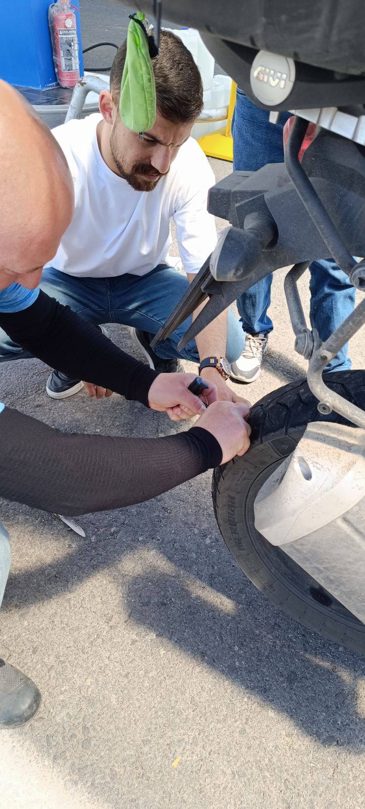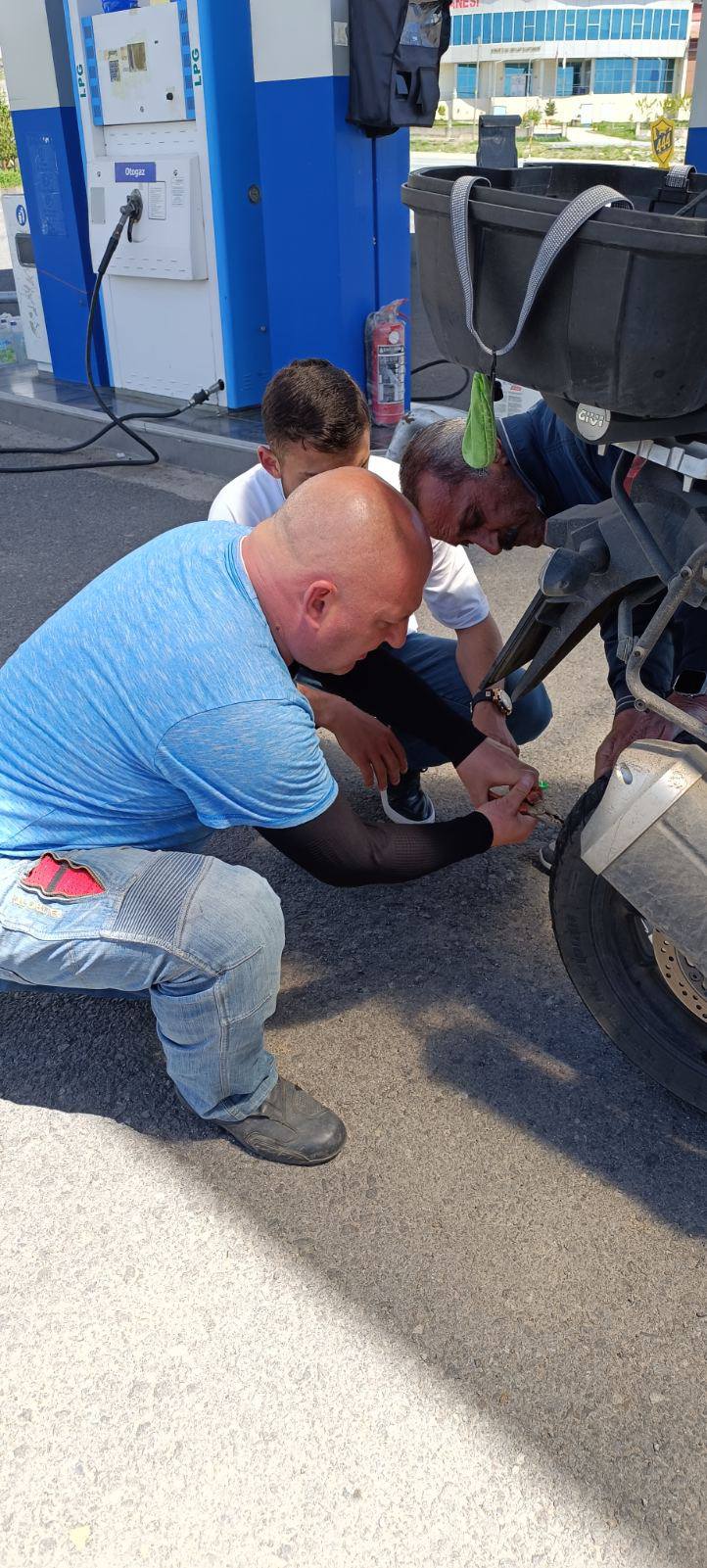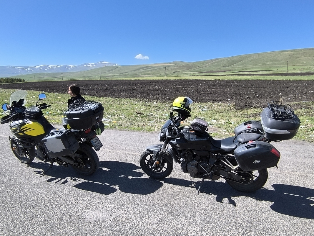 15. dan - Sakartvelo in Hayastan tour Ta dan pa je bil poln dogodkov. Pa recimo temu, konec dober, vse dobro.Po zajtrku je Karmen skočila v lekarno, ker nama je nekaj "šprudlalo" po trebuhih. Ni bilo hudo, ampak recimo, da je imel obisk lekarne in nakup turškega Linexa pozitiven psihološki učinek. Včeraj sva vozila po prahu in vsej možni svinjariji, zato se odločim, da očistim vizirja čelad, snamem pinlocke, da bo ja lep pogled. Sestavim skupaj in greva na pot. Ko zaprem vizir, megla. Jebemti, da nisem mogel prej pogledati. S takim vizirjem ne moreš voziti, odločim se, da na prvi bencinski črpalki narediva postanek, da to uredim. Po kake pol ure vidim bencinsko, zapeljem dol, spravim meglo z vizirja. Vse super. Karmen se je prej hecala, da zdaj vem, kako je, če ima človek sivo mreno na očesu in slabše vidi. Pač, ima svoje ideje ob katerih se smeji, meni pa ni bilo smešno, ker sem vozil z odprtim vizirjem.Stopim do motorja in vidim, da imam na zadnji gumi ful kamenčkov. Pomeni, guma je vroča, da so se prilepili gor. Sprednja nič, motor od Karmen nič. Pogledam malo boljše in vidim, da je tudi nekam nizka. Pritisnem z nogo ob gumo, precej mehka. Jebemomilomater, nekaj sem pobral, spušča. Motor potisnem v senco in vprašam delavca na bencinski, če imajo kompresor. Itak da ga nimajo.Mladenič s črpalke je želel pomagati, pa ni imel s čem. Vpraša me, če bom to saniral sam? Bom probal, druge ni. Zavrtimo kolo, Karmen najde tujek v gumi. Ok, to bom potegnil ven in zakrpal gumo. S seboj vozim tudi komplet za krpanje gum, baterijski kompresor itd. Nato je prišel še en starejši gospod in povedal, da ima v avtu kompresor. Super, ne bo se potrebno matrati z ampulami stisnjenega zraka ali baterijskim kompresorjem. S koničastimi kleščami potegnem ven tujek, porajbam luknjo in pritisnem notri injekcijo (menda vulkanizerji temu tako rečejo). Je pa bolj lepljivi črviček. Napumpamo, sliši se nič, zalijem z vodo, mehurčkov ni. Zmaga. Drži. S prijaznimi domačini spijeva še čaj in nadaljujeva pot. Čez 50km sem zopet polival gumo in preverjal ali kaj piha. Saj veste, tisti čuden občutek. Ampak drži. In če pomislim, megla na vizirju mi je pomagala, da nisem krpal gume nekje za cesto pod milim nebom. V vsakem slabem je nekaj dobrega. Pot sva nadaljevala proti Vanu. Okoliški hribi (2000m.n.v in še več) so pokriti z oblaki, razvijajo se nevihtni oblaki. Zdelo se nama je, da bo v najini smeri približno ok. Ampak ne, ni bilo tako. Začneva se vzpenjati na prelaz, ki ima višino 2650m.n.v.. Cel čas kar dobro piha, tik pred vrhom pa začne padati sodra, dež, čuden mix. Postaviva se na rob ceste, potegneva nase dežjaka. Nadaljevati? Ne, obrneva in se spuščava nazaj v dolino do varne točke, to je bila ena dokaj zapuščena, a delujoča bencinska črpalka. V močnem vetru parkirava, stric na pumpi je prvo mislil, da potrebujeva gorivo. Hitro mu je bilo jasno, da iščeva zavetje. Nekaj časa sva bila zunaj, nato sva se mu pridružila v njegovi mini pisarni. Pogovarjati se nismo mogli, ker se nismo razumeli, s pomočjo prevajalnika sem se mu zahvalil za zavetje. Sedimo v tišini, ponudi mi nek hud cigaret. Vzamem, prižgeva in naprej v tišini čakamo, da neurje mine. Prijazen stric.Po eni uri bivakiranja se odločiva, da, ponovno probava čez teh 2650m.n.v. Zahvaliva se najinemu gostitelju in se poslovimo. Upal sem, da ne bova zopet pod vrhom obračala.Ni bilo potrebe obračati. Juhu.Ko sva prišla do jezera Van, je sijalo sonce. Naredila sva postanek kar ob cesti, slekla dežjake, poiskala v mestu Van prenočišče in gas do končne lokacije. Če povzamem, prebava ok, guma drži, lepi razgledi, nove izkušnje in prišla sva na cilj.Pa še to. Ljudje so ljubeznivi, radi pomagajo. Google je velik pomočnik v komunikaciji. Četudi ne bi bilo Googla, dokler je na licih nasmešek, je vse ok. Jutri pa naprej. Ne greva v Iran, čeprav sva zelo blizu, tudi v Sirijo ne. Počasi proti zahodu.