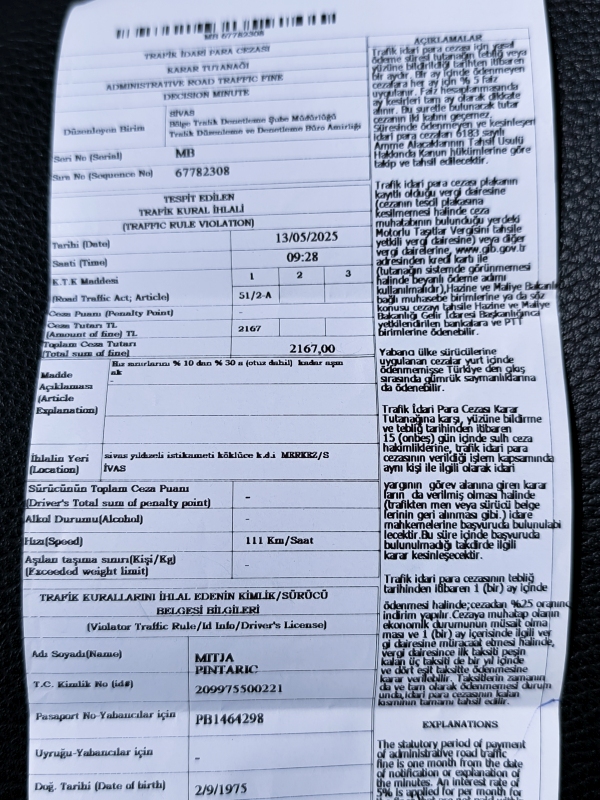 18. dan - Sakartvelo in Hayastan tour Današnji dan pa je bil, sploh ne vem, kako ga naj opišem. Pa recimo temu, da je 13 srečna številka (13.5.2025). Konec dober, vse dobro.V mislih sva imela kar zajetno etapo, proti na zahodni del Istanbula. To bi nama tudi uspelo, če ne bi bilo vmes zapletov.Za začetek sva v prvih pol ure vožnje imela opravka s prometno policijo. Nekje je bil radar, nisva ga videla, niti nisva vedela, da voziva prehitro. Bila sva v dobri veri, da sva znotraj omejitve (110km/h), pa nisva bila. Omejitev 90, midva sva bila za turške standarde prehitra za 11km/h. Veliko krat niti ne veš ali si znotraj gabaritov ali ne, ker ti ni jasno koliko je omejitev. To je bilo jasno tudi policistoma. Moram reči, da kljub temu, da sva dobila vsak svojo položnico, da sta bila zelo korektna in prijazna in sta nama skušala razložiti kakšene so omejitve na določenih delih ceste. Položnico bova plačala na meji (50€), če si tukaj kaj dolžan, ne boš zapustil države. Gre nekako takole, ko plačaš vse kar si zakrivil, lahko zapustiš državo. Na prvem postanku, kjer sva dolila tudi gorivo, sva spoznala zelo prijaznega lastnika bencinske črpalke, s katerim sva se kar zaklepetala, saj je delal v Avstriji in zna nemško. Pozna tudi nekaj nam poznanih kletvic iz naše bivše domovine, saj je imel sodelavce iz skoraj vseh naših bivših republik. Naslednji dogodek je bil stik mojega motorja z osebnim vozilom. Moji prijatelji policisti rečejo temu prometna nesreča z materialno škodo. Nekako tako.Vozila sva po državni cesti, ki ima v eno smer dva vozna pasova in odstavni pas, tako kot naša AC. Vozil sem po desnem pasu cca 90km/h, saj sem bil še pod vtisom prej dobljene kazni.V nekem trenutku je bil moj vozni pas dokaj razrit, pomeni luknjast in neravnine, zato sem se temu umaknil v levo, ob tem spregledal avto, ki me je prehiteval in sva zadela. Začutil sem trk, motor je zawobblal, krmilo je močno zaplesalo, vendar sem zadevo umiril in se je vse končalo super. Lahko bi padel kot snop, ampak me nekdo tam zgoraj čuva. Hvaležen.Karmen je vozila zadaj, zgodilo se je tako na hitro, da ni dojela kaj se je zgodilo. Ko sem ji rekel, da sva se z avtom dotaknila, ji je komaj postalo jasno za kaj gre.Lastnik vozila ni vedel kaj bi, nato je poklical policijo. Policista sta bila na kraju dogodka zelo hitro. Chat GPT je bil glavni prevajalec. Policistoma povem, da sem se izogibal luknji in zadel vozilo. Rekel je samo ok. Gleda motor, gleda avto. Jaz imam na kufru eno prasko, avto pa črn od plastike levega kufra.Nato sva oba opravila alkotest. 0.0, tako kot mora biti. Policist mi razloži, da sta dve poti. Ena je urejanje zadev preko zelene karte z zavarovalnico ali dogovor o višini stroškov na licu mesta. Lastnik vozila je rekel da želi 400$. Policista sta rekla da ni toliko škode. Pol smo prišli na 250€. To sem bil pripravljen dati, nakar si lastnik avta premisli in bi on zavarovalnico. V redu, pa zavarovalnica. Pol še nekaj koleba kaj bi, nakar sta se oba policista začela dreti nanj, pojma nimam kaj. In pol mi policist reče, če sem pripravljen dati 230€? Seveda, saj bi dal tudi 250€. Kar sama sta mu zbila znesek, kar naenkrat sta bila cenilca škod.Končno si z lastnikom podava roki, dam mu denar, policista opazujeta predajo denarja. Nato sta ga preprosto nagnala in smo ostali sami.Policist je rekel, da so oni tisti, ki nam turistom pomagajo, da je to njihova dolžnost itd. Veliko je povedal, nisem si zapomnil vsega, imam pa shranjen ves tekst, ki ga je prevajal chat GPT.Na koncu smo naredili še en selfie, ob slovesu sta nama z dlanmi pokazala še srčke. S tem je rekel, da je postopek zaključen in da naj lepo in varno potujeva. Res reakcija policije, kot je nisem vajen. Res je tudi, da nimam nekih izkušenj s slovenskimi policisti, niti jih ne želim. Glede na uro sva vedela, da ne bova prišla, tako daleč, kot sva imela nek okviren načrt. Na naslednji bencinski sva določila končen današnji cilj, to je Bolu. Pri temperaturi pod 10°C sva prišla do hotela čisto premražena, saj se na pumpi nisva dodatno oblekla. Ima pa hotel savno, ki je danes zelo prav prišla. In če se navežem na današnjo 13ko. Lahko bi jokal in jamral, kako je šlo vse v kur***, kako nesrečen dan itd. Bil je srečen dan, nikomur se ni nič zgodilo, bogatejši sem za novo izkušnjo v prometu in prijetne izkušnje z ljudmi, ki sem jih spoznal. Bil je dober dan.S Karmen sva debatirala o vseh današnjih dogodkih in sva prišla do zaključka, da je to bil najbolj intenziven dan, gledano na vsa potovanja, kar sva jih naredila.Jutri nameravava zapustiti Turčijo.